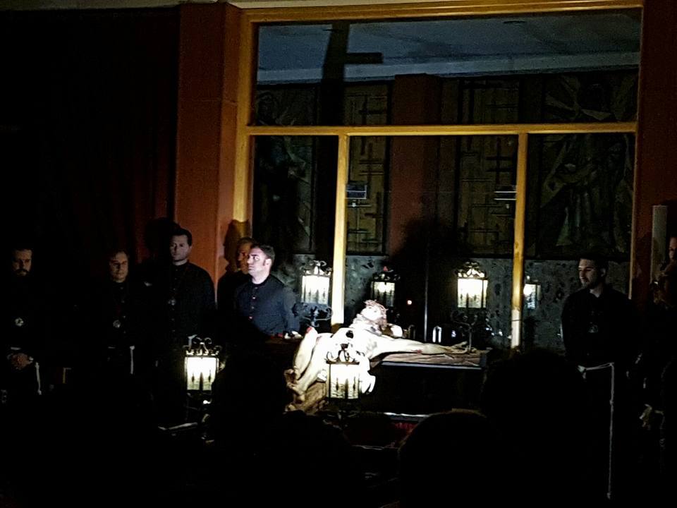 Todos los cofrades de la Hermandad esperamos con devoción la llegada de la Semana Santa, en especial una fecha marcada en rojo en nuestro especial calendario. Nos referimos al Lunes Santo, cuando por la noche acudimos a acompañar al Santísimo Cristo de las Angustias en la bajada del altar de la iglesia de la Sagrada Familia. Un momento de inefable misticismo para muchos de los presentes, que envueltos en el mágico manto de la oscuridad casi total en el templo, sólo pueden escuchar el redoble del tambor o la lastimosa trompeta que impregna con su sonido el ceremonioso acto.