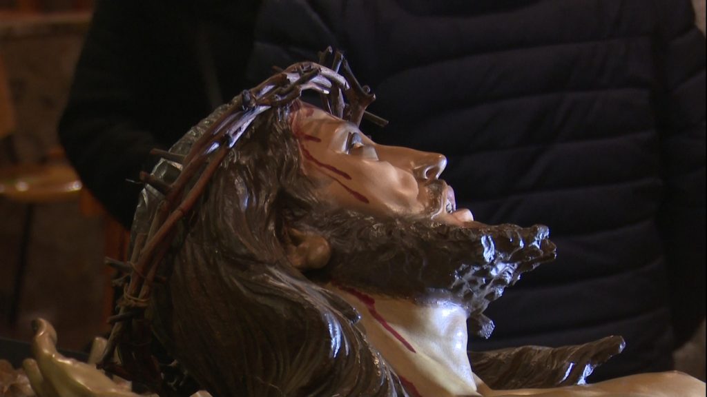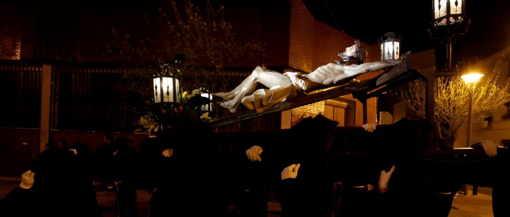 La realista imagen del maestro Miguel Ángel Casañ queda entonces expuesta por unos minutos a la entrada de la iglesia, sobre una austera parigüela iluminada con grandes faroles, que será transportada a hombros de voluntarios que viven este momento con el magnetismo que provoca saber que se está llevando al Cristo a su madre, María, que le espera en el trono-anda que guardamos en el Museo de la Semana Santa. Junto a María, otros dos personajes aguardan también la llegada del Crucificado, del Cristo de las Angustias, el último Cristo todavía vivo en el reguero de imágenes que atesora la Semana Santa de Gandia.
